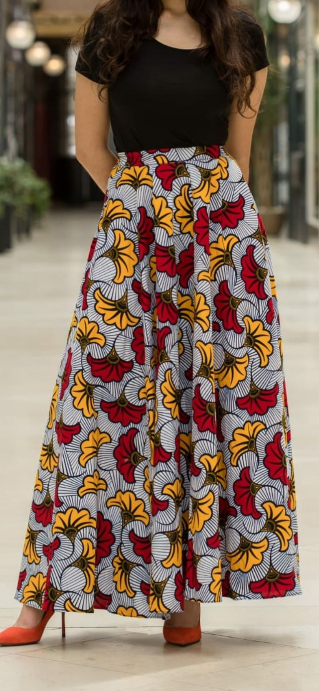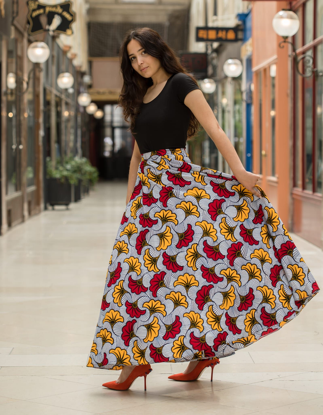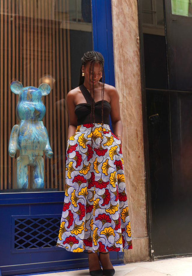 Sublimez votre silhouette avec la jupe "Fleur de mariage", une pièce forte et féminine qui marie l’audace des imprimés wax à une élégance intemporelle.