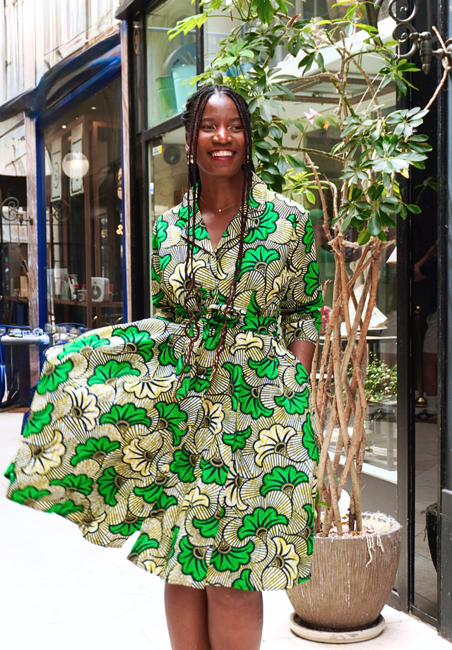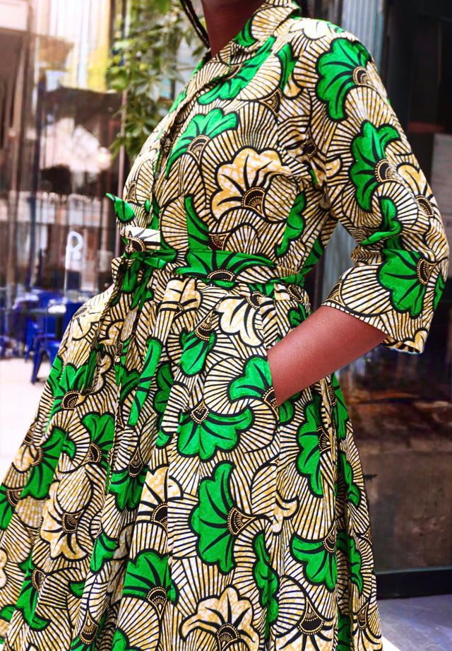 Ce modèle en wax au motif “Fleur de mariage” mêle un vert vibrant, un jaune pâle et des touches de noir pour un résultat à la fois élégant et original.