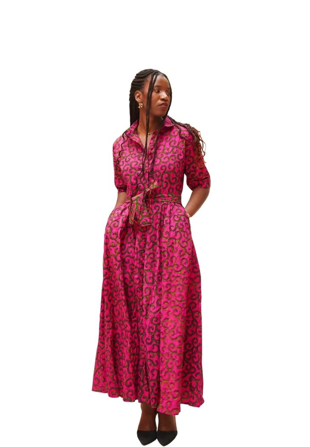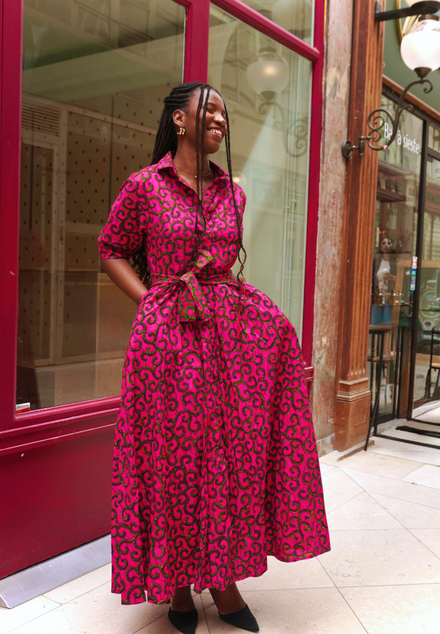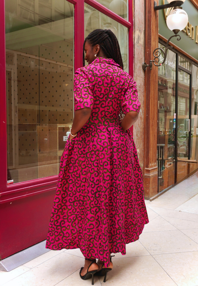 Élégante, audacieuse et vibrante, la robe en wax motif Macaroni attire tous les regards avec son rose intense et ses volutes vertes foncées.