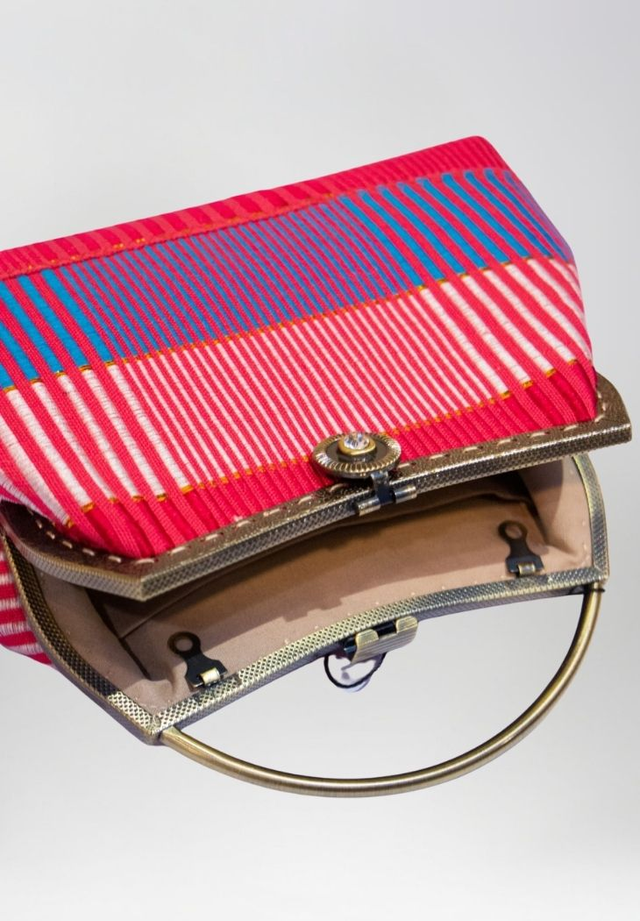 Ses rayures fuchsia, bleu et or, sa structure rigide et sa poignée dorée lui confèrent une présence forte et raffinée.