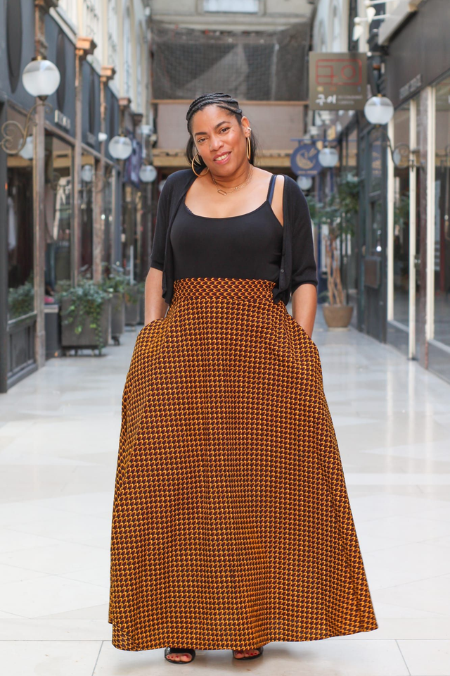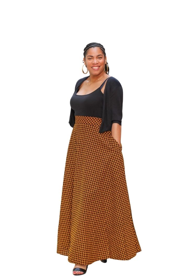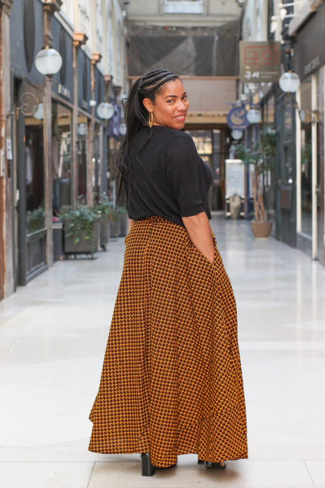 Avec son motif géométrique "Écaille", cette jupe longue en wax est une invitation au style affirmé et raffiné. Sa coupe fluide et sa taille haute mettent en valeur la silhouette avec légèreté, tandis que son tissu 100 % coton lui assure structure, confort et tenue parfaite.