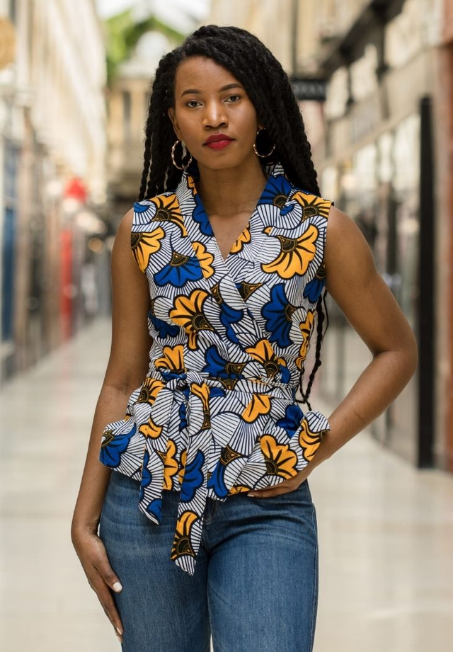 Pantalon large en wax "Fleur de mariage" - bleu et jaune